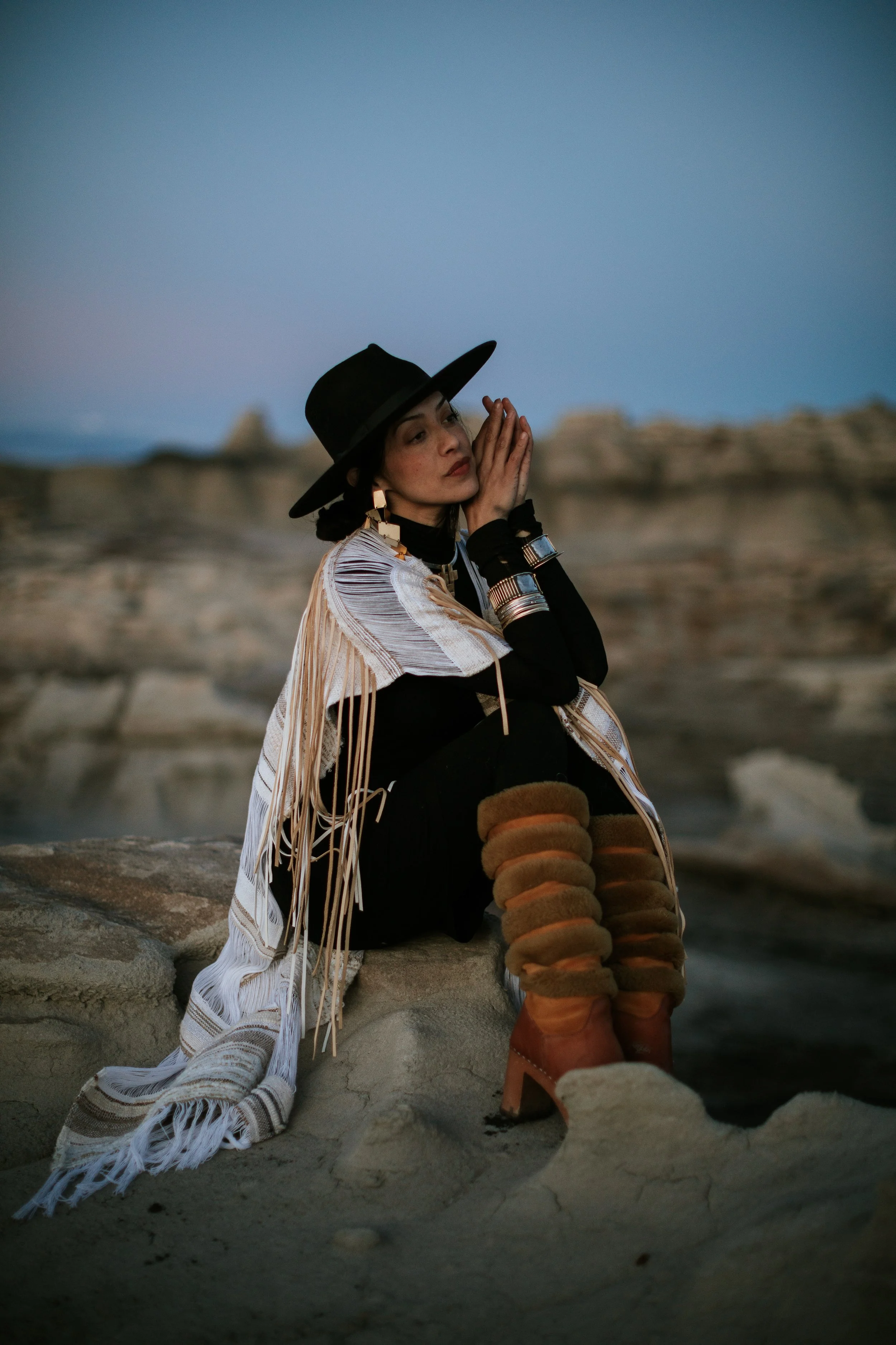 Rhiannon’s original creative practice in beadwork & fine jewelry provided with her a focused, quiet discipline to launch into Fine Art & Wearable Art Textiles. Her Mexican, Tohono O’odham & Spanish ancestry act as the portal that informs her weaving practice while embracing the cultural arts of these lineages in a modern way. Her textiles are collected globally and many clients commission bespoke works to imbue both their wardrobes & homes. She is happiest weaving textiles that reflect the unique landscapes she travels too, often drawn to unusual geological forms. She engages in natural dyeing, utilizes sustainable fibers as often as possible & believes that handwoven textiles thoughtfully made, are objects of art to bring back the old ways of slower living.