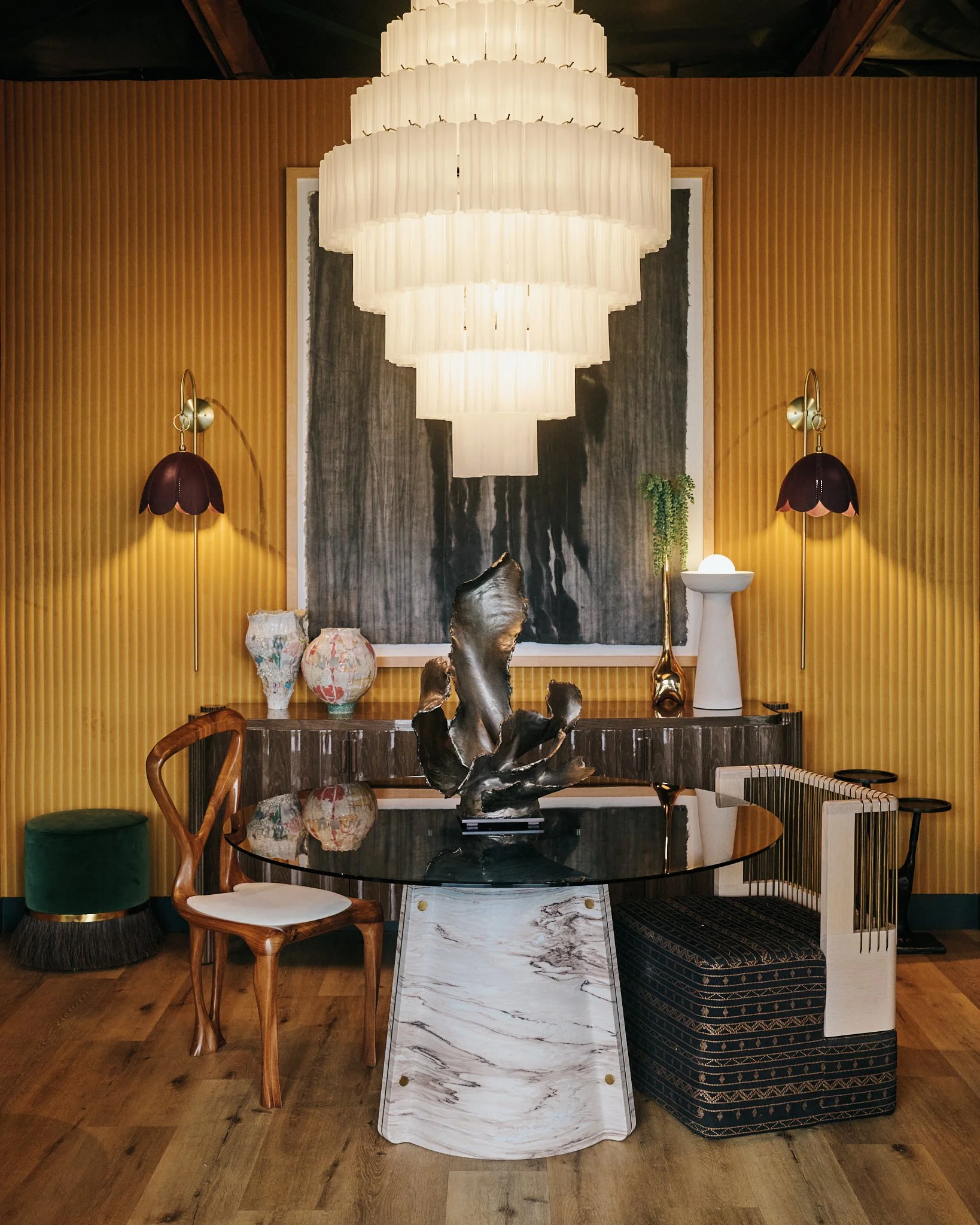 A curated collection of Rhiannon’s work will be installed throughout the showroom, creating a conversation between art and material. Her pieces are tactile and dimensional, built through a process that celebrates craftsmanship, the Southwest and heritage.Rhiannon will be in attendance to speak about her practice, what informs the work, and the steps behind each piece.
