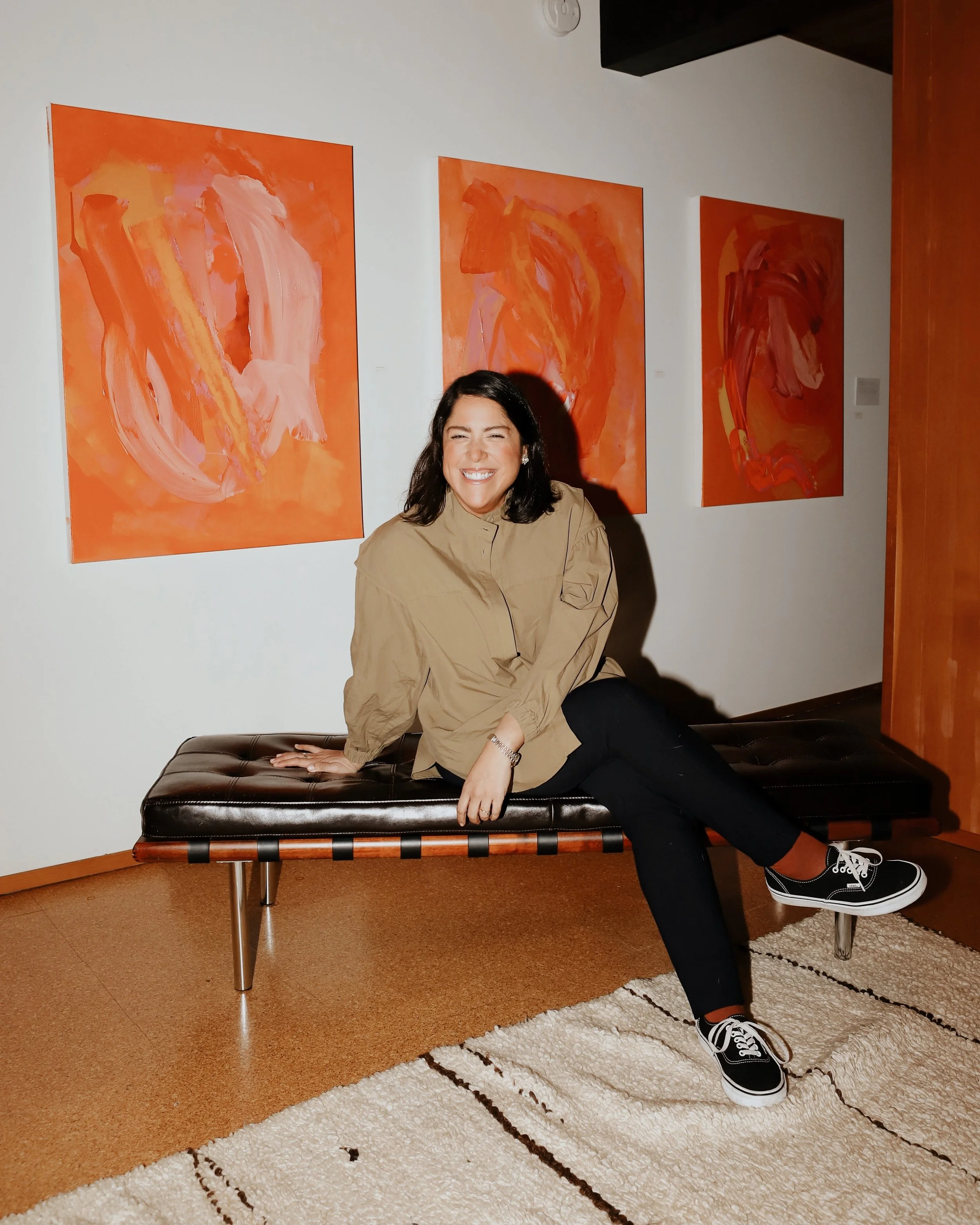Her recent work appears in Ethereal Reflections: The Open House, an exhibition that turns a mid-century home into a lived-in gallery. Curated by Modern Homes Collective with two Portland collaborators, the show places contemporary art within the clean lines and natural materials of the house. Stephanie’s four paintings, filled with pinks, oranges, and yellows, act as small emotional landmarks throughout the space. They trace her earliest impressions of the Pacific Northwest: feeling welcomed, finding her footing, and beginning to settle in.